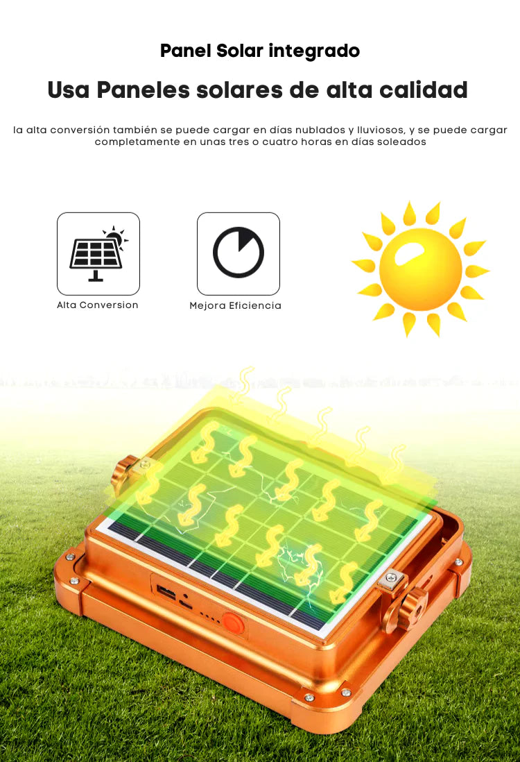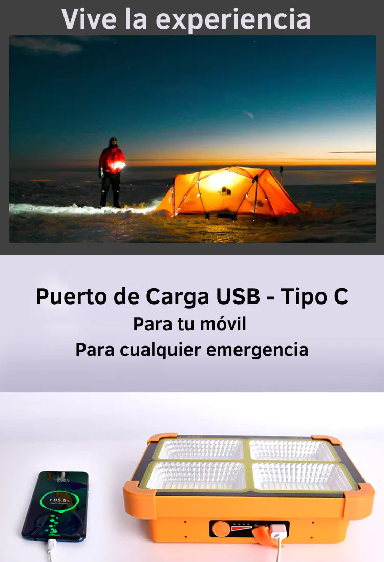 La tecnología de Carga Solar y Carga por USB asegura que siempre podrás recargar tu foco, incluso cuando no tengas acceso a la electricidad. ¿Lo mejor? Actúa también como un power bank para mantener cargados tus dispositivos móviles cuando más lo necesites.